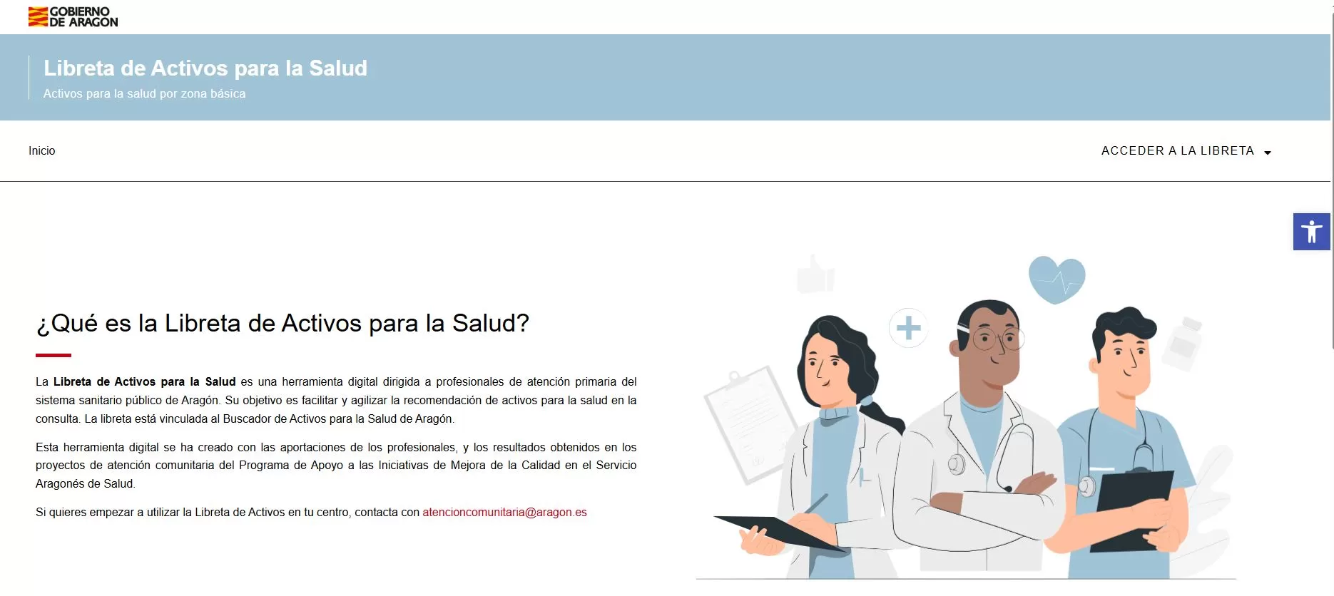 La Libreta de Activos para la Salud es una herramienta digital dirigida a profesionales de atención primaria del sistema sanitario público de Aragón. Su objetivo es facilitar y agilizar la recomendación de activos para la salud en la consulta. La libreta está vinculada al Buscador de Activos para la Salud de Aragón.