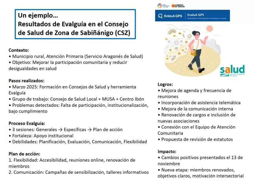 A través de la implementación de la herramienta Evalguía en el Consejo de Sabiñánigo, se detectaron deficiencias críticas como la excesiva institucionalización y la falta de participación activa de las entidades sociales. El CSZ logró renovar los cargos, flexibilizar el funcionamiento de las reuniones y fortalecer la comunicación interna para poco a poco un modelo de participación ciudadana más real, dinámico y motivado por el bienestar comunitario. Un hito fundamental ha sido la decisión del Ayuntamiento de adherirse a la Estrategia de Promoción de la Salud nacional, asegurando así futuras vías de financiación.