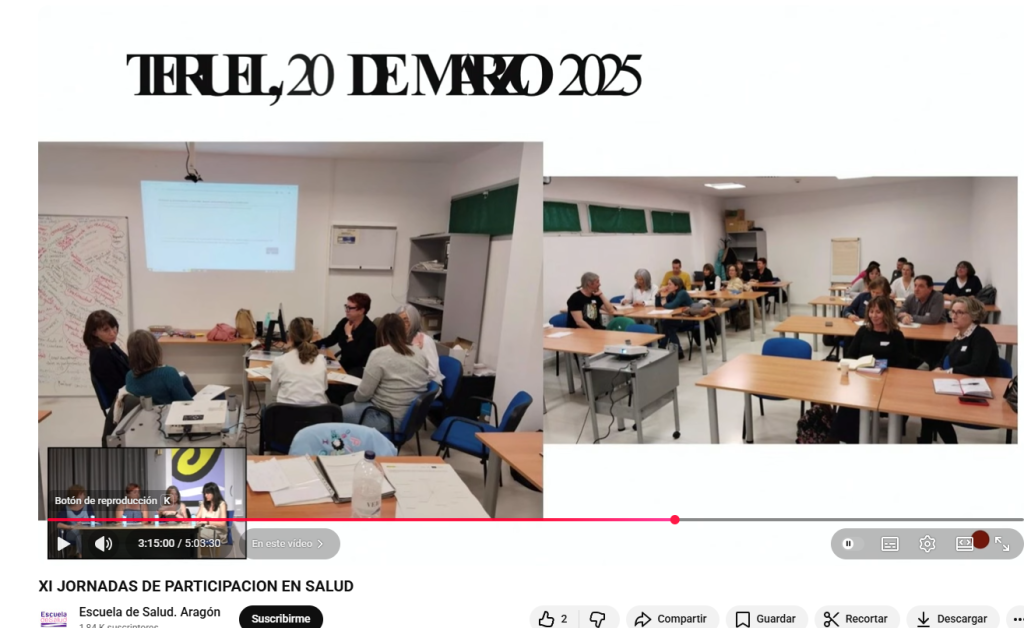 En este vídeo de las XI Jornadas https://youtu.be/SV4z9mjA6ko?t=9898 justo os lleva al minuto 5:03:30 es el momento que es donde comienza la Mesa en la que participaron los facilitadores de los apoyos, y varios Consejos de Salud de Zona como los de Teruel Centro y Ensanche o el de Sabiñánigo.