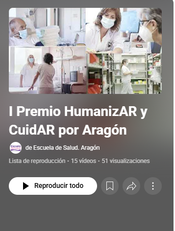 Aquí tenéis a vuestra disposición el enlace directo a la lista de reproducción oficial del I Premio HumanizAR y CuidAR por Aragón, publicada por la Escuela de Salud de Aragón en YouTube. Clica sobre la imagen.