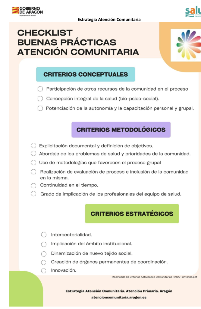 Aqui tienes estos Criterios valoración Atención Comunitarias. En ellos descubrirás como revisar si es una actividad comunitaria o no, que tipo, o que instrumentos de salud comunitaria estas utlizando…y podrás revisar con un check List y unas infografías para saber si vuestras actividades comunitarias son buenas prácticas.