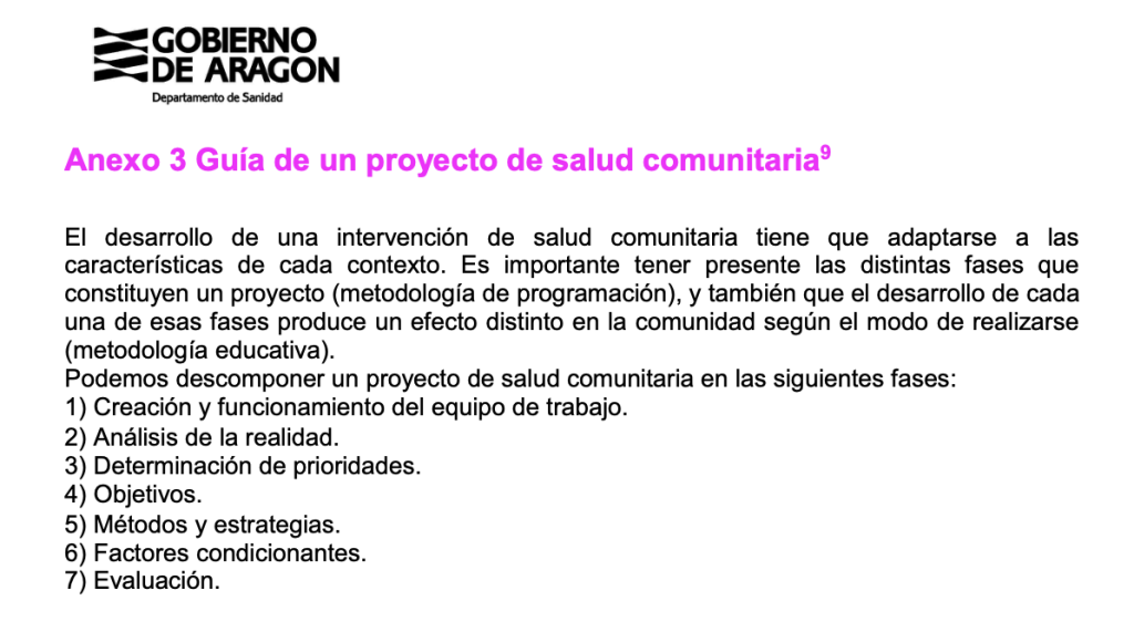 La Estrategia de Atención Comunitaria en el Sistema de Salud de Aragón os proporciona en su documento una GUIA PARA ELABORAR UN PROYECTO DE ATENCIÓN Y SALUD COMUNITARIA
